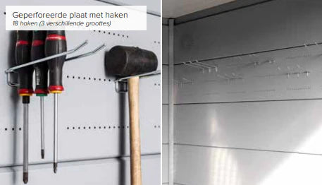 Met de geperforeerde plaat en haken creëer je een praktische opbergruimte in je Classico 2724 tuinhuis. Ideaal voor het ophangen van tuingereedschap, accessoires of andere benodigdheden, zodat alles overzichtelijk en binnen handbereik blijft. Een slimme en ruimtebesparende oplossing voor een georganiseerde opbergruimte.