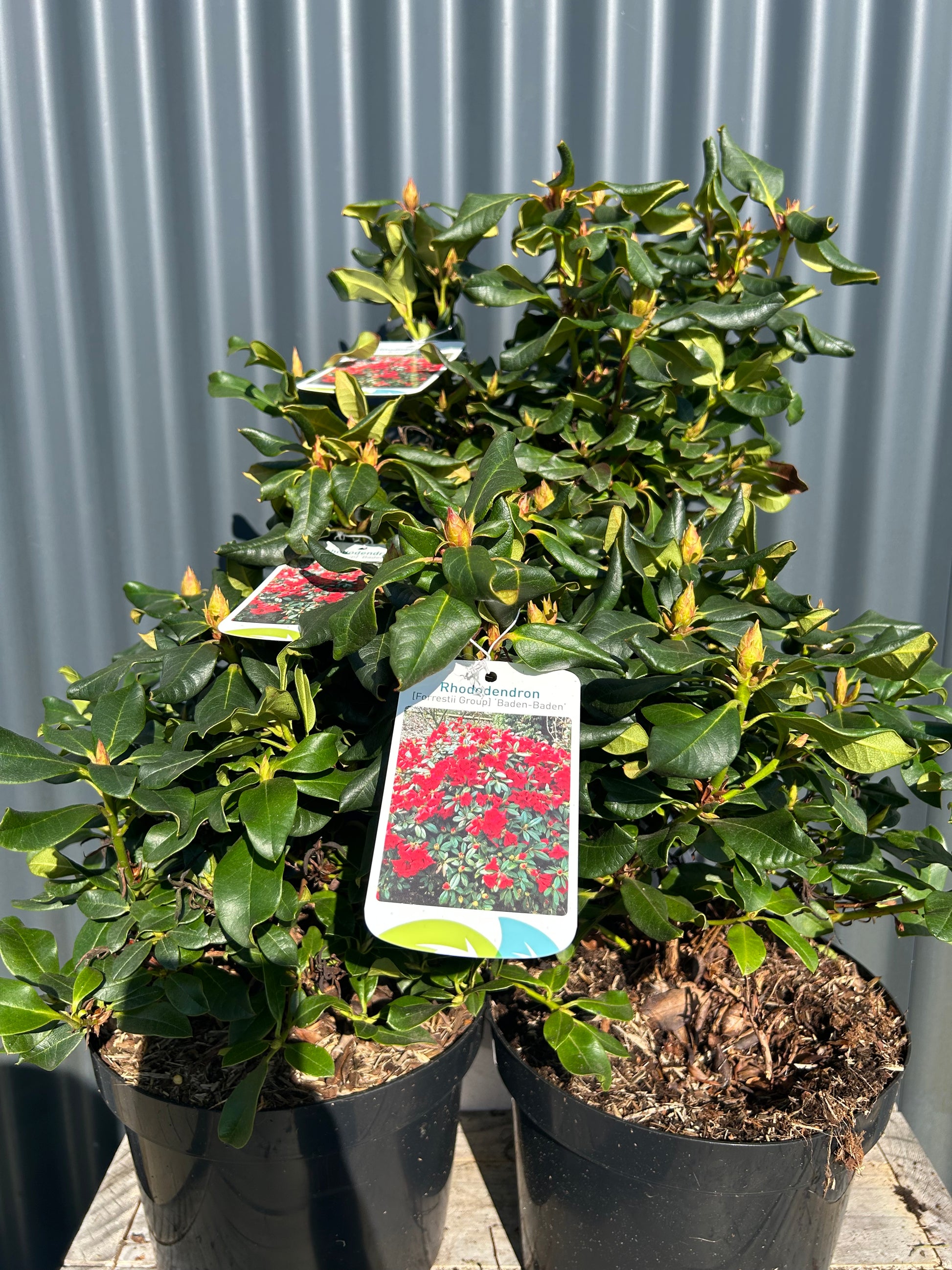 Rhododendron 'Baden-Baden' is een laagblijvende, winterharde struik met een compacte groei en een uitbundige bloei van felrode bloemen in het voorjaar. Het donkergroene, glanzende blad blijft het hele jaar door sierlijk en dicht op de takken.